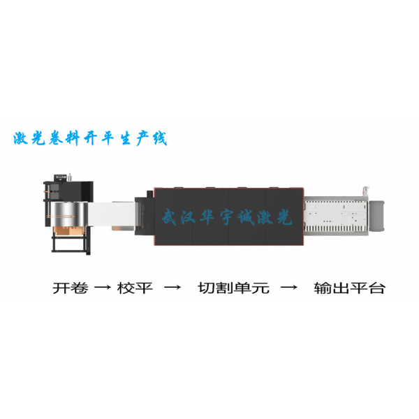 動態高精高速全自動激光開卷落料生產線,采用激光切割技術的開卷落料生產設備,由上料臺車、開卷機、校平機、伺服送料機、激光切割裝置、切割平臺、碼垛裝置、廢料處理系統、液壓氣動系統及電氣控制系統組成。
